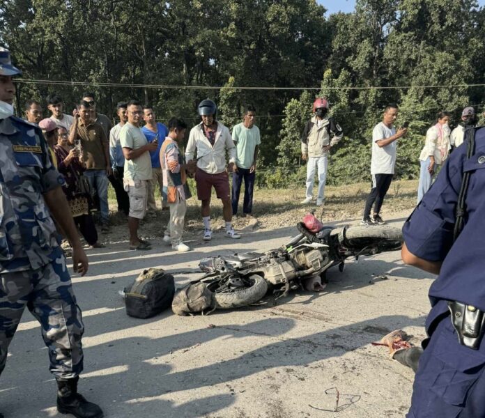 पुर्व पश्चिम राजमार्गमा कावासोतीबाट नवलपरासी तर्फ जाँदै गरेको जिजे१४जेड ६४६ नम्बरको भारतिय बसले सोही दिशामा जाँदै गरेको प्रदेश ३-०२-०१० प ७२३० नम्बरको मोटरसाईकललाई ठक्कर दिएको थियो ।