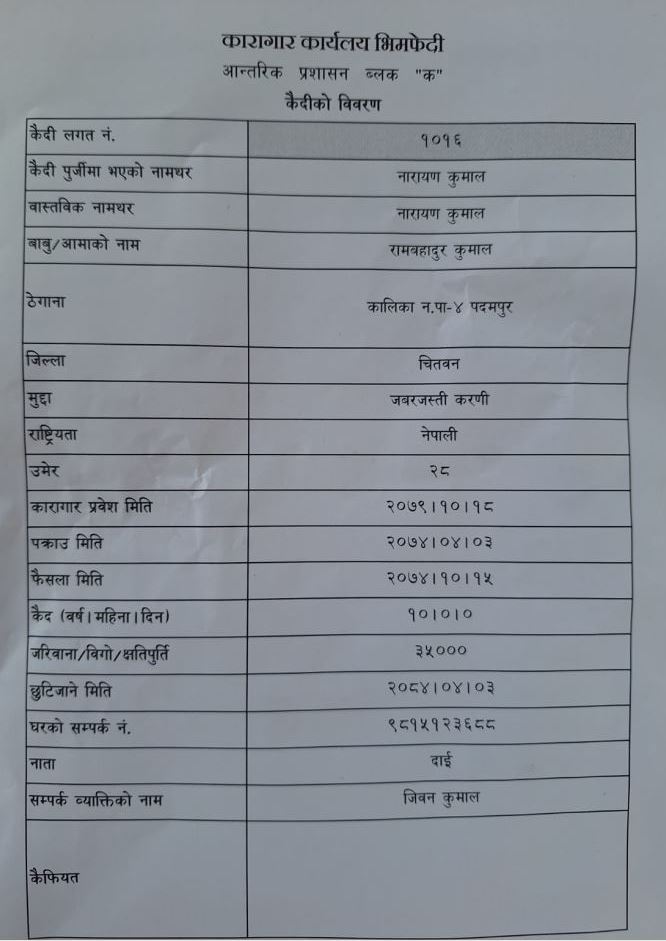 कुमालको वास्तविक ठेगाना भने कालिका नगरपालिका–४ पदमपुर, चितवन रहेको कारागार प्रशासक पौडेलले बताए । उनी जर्वजस्ती करणी मुद्धामा २०७४ साल साउन ३ गते पक्राउ परेका थिए । उक्त कसुरमा उनलाई अदालतले १० वर्ष कैद र ३५ हजार जरिवाना हुने फैसला गरेको थियो । कुमालको २०८४ साउन ३ गते जेलबाट छुट्ने मिति थियो ।