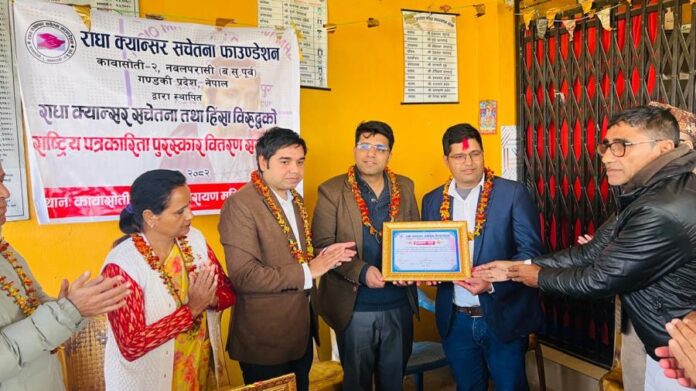 नवलपुर, फागुन ९ गते । राधा क्यान्सर सचेतना फाउण्डेसनले स्थापना गरेको राधा क्यान्सर सचेतना तथा हिंसा विरुद्धको राष्ट्रिय पत्रकारिता पुरस्कार गोरखा पत्रका संवाददाता सरोज ढुंगेललाई प्रदान गरिएको छ । नवलपुरको कावासोती नगरपालिका–२ मा शनिवार विशेष कार्यक्रम आयोजना गरी ढुंगेललाई नगद २० हजार रुपियाँ तथा प्रमाण पत्र प्रदान गरिएको हो ।