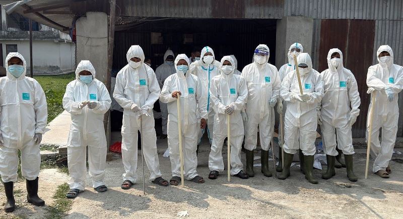 “कुखुराको टाउकोमा हिर्काएर नष्ट गरिन्छ“ उनले भने, “त्यसपछि गहिरो खाल्डो खनेर चुन र ब्लिचिङ पाउडर प्रयोग गरी सुरक्षित तरिकाले पुर्नुपर्छ ।” ठुलो सङ्ख्यामा कुखुरा पुर्नका लागि डोजरहरूको प्रयोग गरिएको छ ।