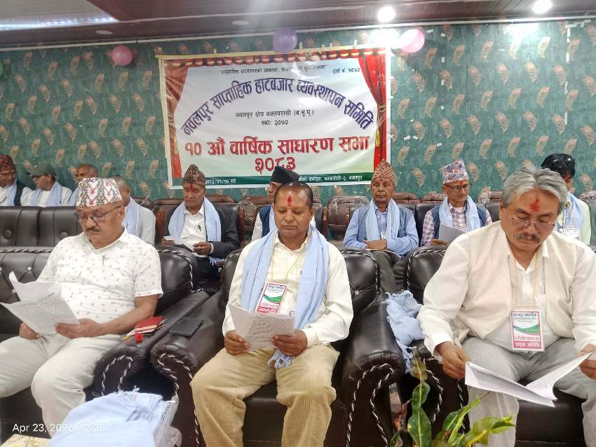 कावासोती, बैशाख ११ गते । नवलपुर साप्ताहिक हाटबजार व्यवस्थापन समितिको १० औं वार्षिक साधारण सभा बिहिबार कावासोतीमा सम्पन्न भएको छ । कावासोती–२ स्थित खानेपानीको सभाहलमा सम्पन्न भएको साधरण सभाले कोषाध्यक्ष सरस्वती अधिकारीले प्रस्तुत गरेको आर्थिक प्रतिवेदन र अध्यक्ष डोलराज चापागाईँले प्रस्तुत गरेको वार्षिक प्रगति प्रतिवेदन पारित गरेको छ ।
